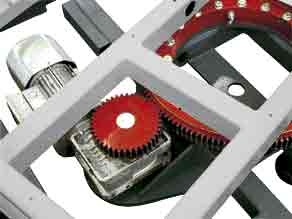 Die solide Bauweise der Maschine zeigt sich in vielen Details. Die rechte Abbildung zeigt die Lagerung des Drehtellers auf einem Präzisions-Kugeldrehkranz und den Antrieb duch einen Getriebemotor über die Aussenverzahnung des Drehkranzes. |